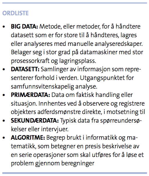 Tilgangen til slike data er dessverre begrenset. I tillegg krever det å arbeide med dem, programmeringsferdigheter langt utover det som undervises ved de samfunnsvitenskapelige instituttene i landet. I temaseksjonen av siste Tidsskrift for samfunnsforskning tas det opp flere aktuelle problemstillinger knyttet til Big Data. Et gjennomgående tema er de etiske betenkeligheten ved å benytte seg av offentlig tilgjengelige ytringer.