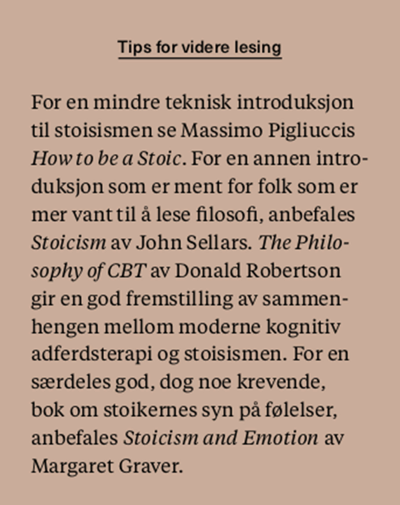Vi har nå bare så vidt skrapet i overflaten på et større filosofisk system, som har mange fasetter og teorier om det meste. Vi håper at vi har klart å pirre lesernes interesse for den stoiske filosofien og gitt inspirasjon til videre lesing.