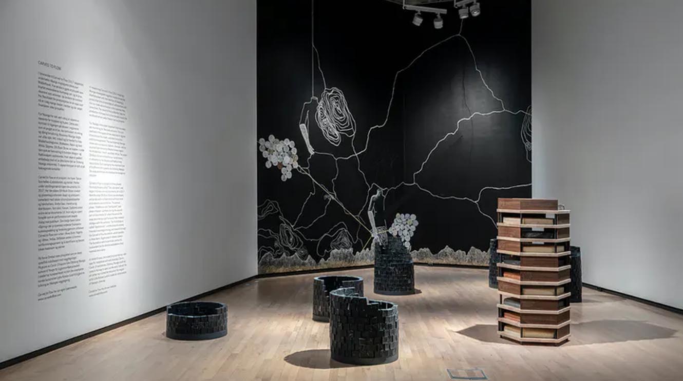 Recipient of the Lise Wilhelmsen Art Award Programme at Henie Onstad Kunstsenter, one of Europe’s largest long-term schemes, Otobong Nkanga (b. 1974, Kano, Nigeria) is the first of sixteen artists who will be awarded in the following 32 years. Beyond the award, the program consists of funds to produce an exhibition at Høvikodden, an exhibition catalog, and the acquisition of art for the Henie Onstad Collection, in this case “Revelations” (2020), as a way of keeping the memory of the award and building up a body of works for the public.