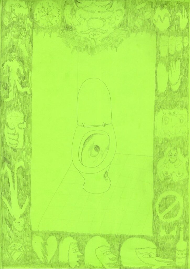 Armane ligg slapt over doringen i eit forsøk på å halde kroppen oppe. Kanskje hovudet skal legge seg ned på doringen også? Nei, det vert for ekkelt. Nok at henda er der. Æsj. Kroppen lenar seg nærmare doen, slik augene ser ned mot vatnet. Magen er uroleg. Ventar. Nei, ikkje noko no heller. Faen. Burde ikkje ha drukke så mykje.