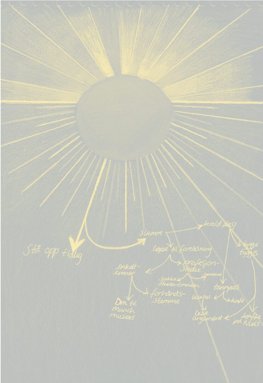 Jeg skal imidlertid innrømme at metoden ikke er uproblematisk for de av oss som identifiserer seg som både morgenfugl og natteugle. For når man er like glad i å bli sittende oppe og høre på «12 hours of medieval lofi chill with rain», skrive metasatiriske essay som på ingen måte matcher lydsporets «ancient and dreamy vibe» og bånne enda mer kaffe – ja, så hender det på mystisk vis at alarmen som ringer i femdraget slumres!? Men det er naturligvis ikke noe jeg kan holdes ansvarlig for, ettersom handlingen utføres i en bevisstløs tilstand. Du tenker kanskje at en løsning for slike som meg er å snu hele døgnet? Vel … Etter å ha forsøkt nettopp det ved å påta meg et utall nattevakter på en psykoseavdeling, innså jeg at jeg behøver min skjønnhetssøvn og ikke minst at det er på sin plass med en henvendelse til Språkrådet for å få endret ordtaket «det er fra fulle folk og barn man får høre sannheten».